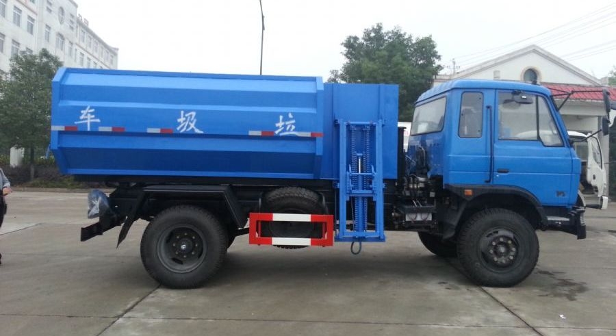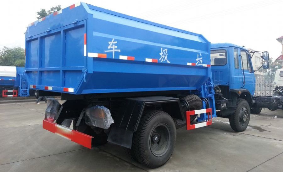 工作原理:自装卸式垃圾车是由密封式垃圾厢、液压系统、操作系统组成,能配几十个垃圾桶,实现一车与多个垃圾桶联合作业,厢体上的液压升降装置可将垃圾桶吊上、放下,上下升降,上下一次工作循环时间为50S,密封式厢体环保卫生,可避免二次污染。其自装式的挂桶装置可直接将路边的垃圾桶挂在上面用提升机直接到在垃圾箱体里面省去了装垃圾的麻烦。