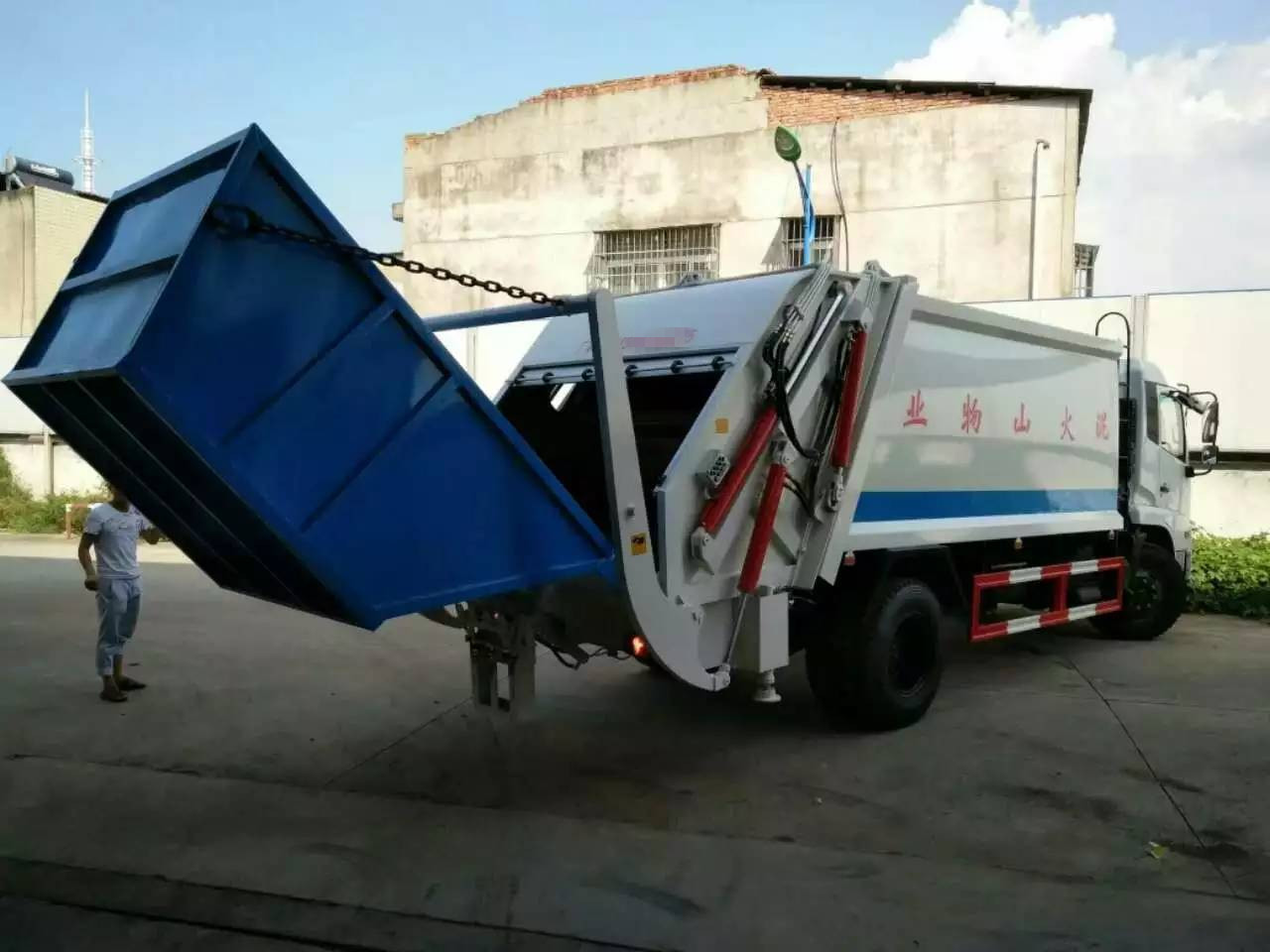 选装多种翻桶(斗)机构 不同用户可根据不同的垃圾搜集方式,选装不同的翻桶(斗)机构:翻标准垃圾铁桶ZBT59003-88(300 L)、塑料垃圾桶(240L)、随车小垃圾斗、密封遮盖式垃圾斗、大垃圾斗。